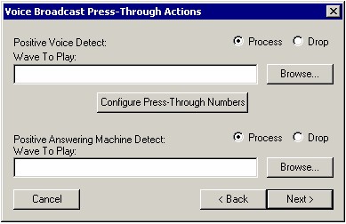 The administrator may define two different messages that are to be played when a Press Through campaign is being created. A specific action can be declared based upon contact with an individual versus an answering machine.