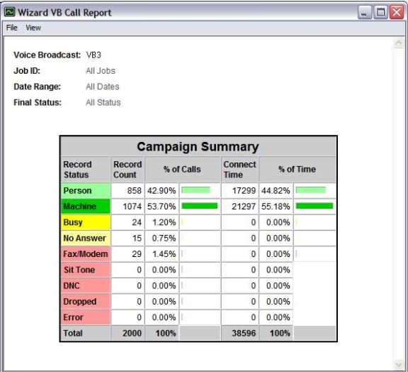 The Campaign Summary report simply provides a listing of the general performance of a voice broadcast campaign. Items include a count and percentage of numbers called plus the total connect times for live answers and answering machines.